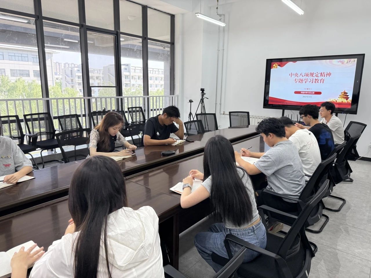 卓越本科生党支部于学院319会议室开展深入贯彻中央八项规定精神学习教育,党支部书记张馨月、党支部副书记刘平利及全体学生党员参会。