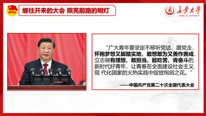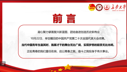宣讲会上,长安大学星火宣讲团的六位宣讲人围绕“党的二十大”这一主题,结合时代背景与现实机遇,讲述了党的二十大对当代中国青年的重要意义,围绕党的二十大的主题和主要成果、以中国式现代化全面推进中华民族伟大复兴、全面建设社会主义现代化国家的目标任务等方面,对党的二十大精神进行了全面深入宣传阐释,论述了“时代造就青年,盛世成就青年”的观点,呼吁当代青年为党的伟大事业贡献青春之我,奋斗之我。在宣讲结束之后,杨越、杜明阳等六位同学发表了自己对于本次宣讲会的学习感想,表示会将党的二十大精神铭记于心,并积极落实到自身实践中去。