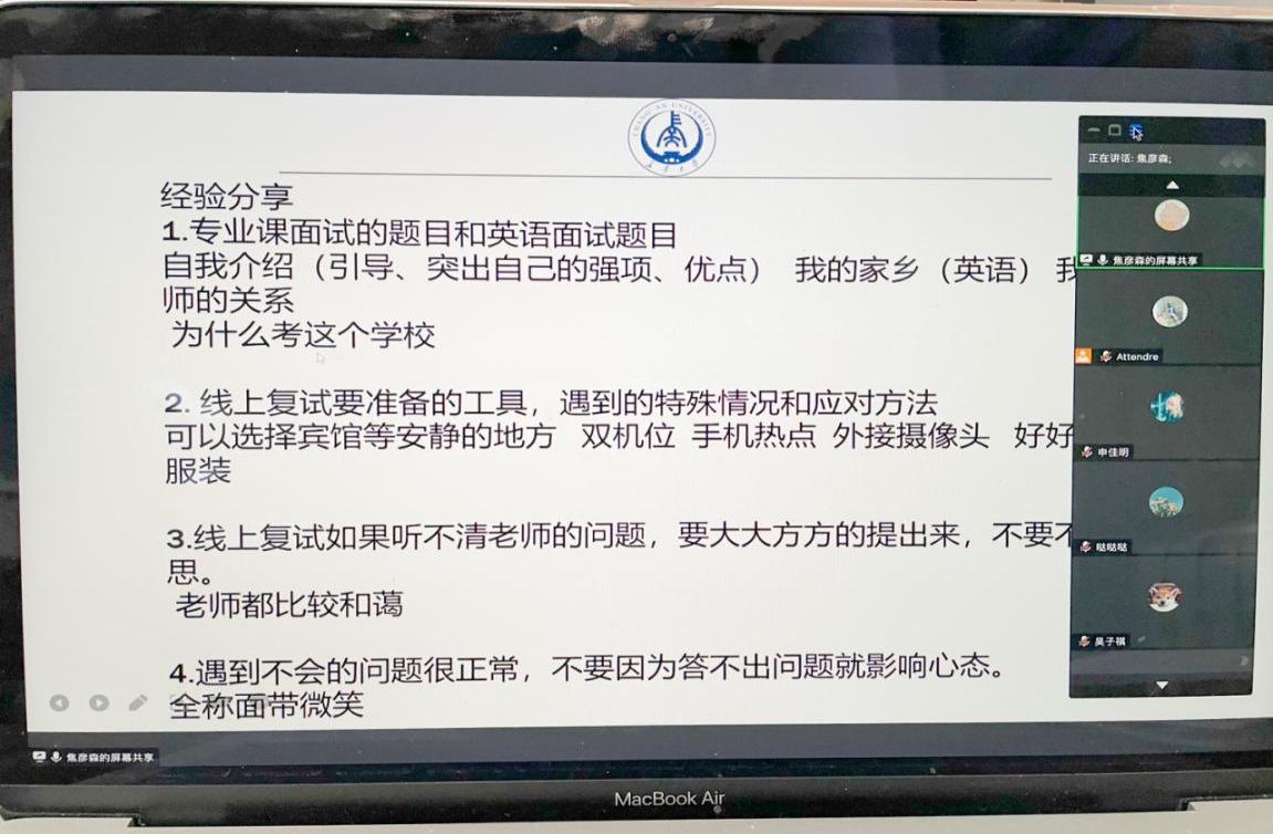 在腾讯会议举办考研复试线上经验交流会,邀请9位优秀的在读硕士研究生为即将参加考研复试的同学做经验介绍。太阳城平台