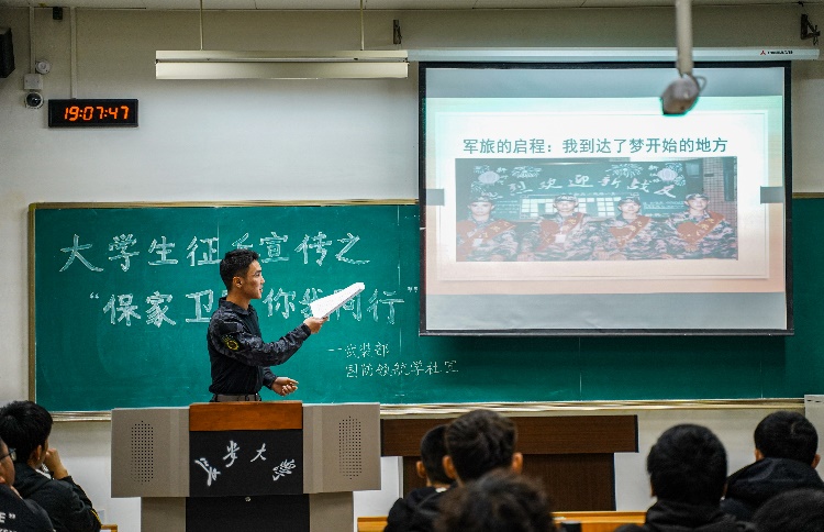 联合我校武装部指导国防领航学社于4月2日在明远WM1309教室开展了以“保家卫国、你我同行”为主题的征兵宣讲活动。本次宣讲活动由长安大学武装部刘天宇老师指导,武装部弘毅中队成员赵大乐同学主讲,太阳城平台