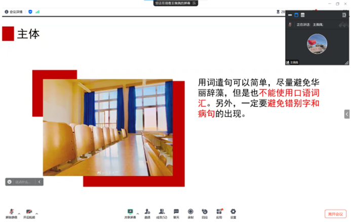 王佩佩从校园媒体的责任、新闻稿写作、流程规范以及常见问题等方面展开进行培训。他强调了要严格落实“三审三校”制度,各环节均要把握新闻的六要素,注重语言的打磨,层层递进,完成更多高质量的新闻稿。最后,他对文字表达及照片拍摄存在的常见问题进行讲解并提出切实可行的解决方法。
