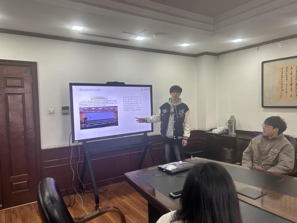 陈桥驿代表研科协做工作报告,总结了过去一个学期研科协在学术讲座、竞赛指南、思想引领、对外交流等方面的基本情况,并对下一步的工作计划进行部署。他表示之后会优化学术讲座筹办业务能力,积极吸纳意见建议进行改进。