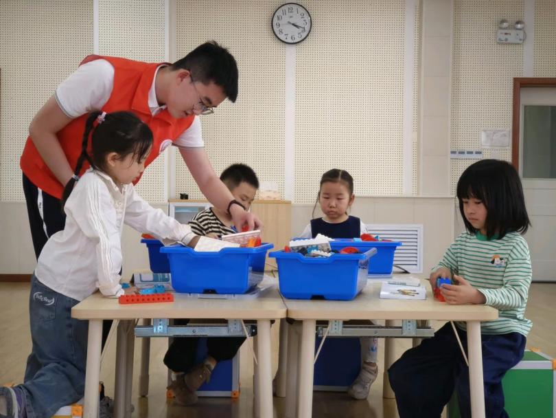 实践操作环节,在志愿者的引领指导下,小朋友们依序领取零件组装长颈鹿造型的机器人。操作过程中,针对小朋友们遇到的问题,志愿者耐心引导,鼓励小朋友们积极运用学到的知识和原理,全身心投入机器人的组装,尽情享受着创造的乐趣。这场充满挑战的实践,不仅让知识从课本走进现实,更让孩子们体验到了"思考-尝试-突破"的完整创造过程。