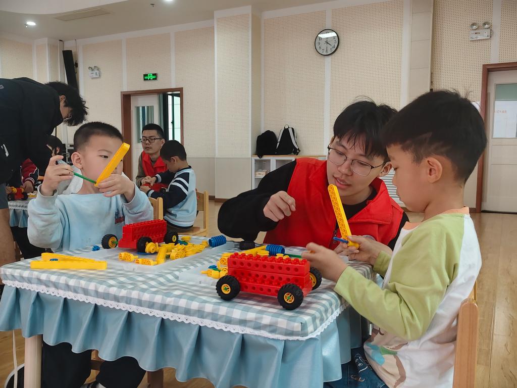各本科生及研究生党支部联合电控科协、机器人俱乐部,走进长安大学朱雀幼儿园,开展“机器人科普进校园”志愿服务系列活动(第24期)。本次课程以“智慧小齿轮——小小杠杆魔法师”为主题,张佩奇、张云龙、陈祎臻等志愿者与幼儿园教师共同参与授课,带领大班孩子们在积木搭建中解锁杠杆奥秘,感受科学与实践的乐趣。