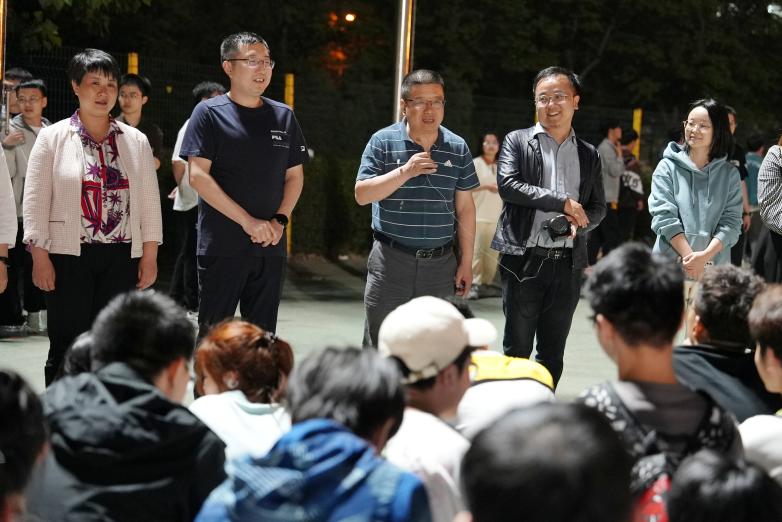 4月17日晚,太阳城平台 院长闫茂德、院党委副书记李阳来到北校区朝晖体育场慰问学院备战校运动会的全体辅导员、运动员和工作人员。