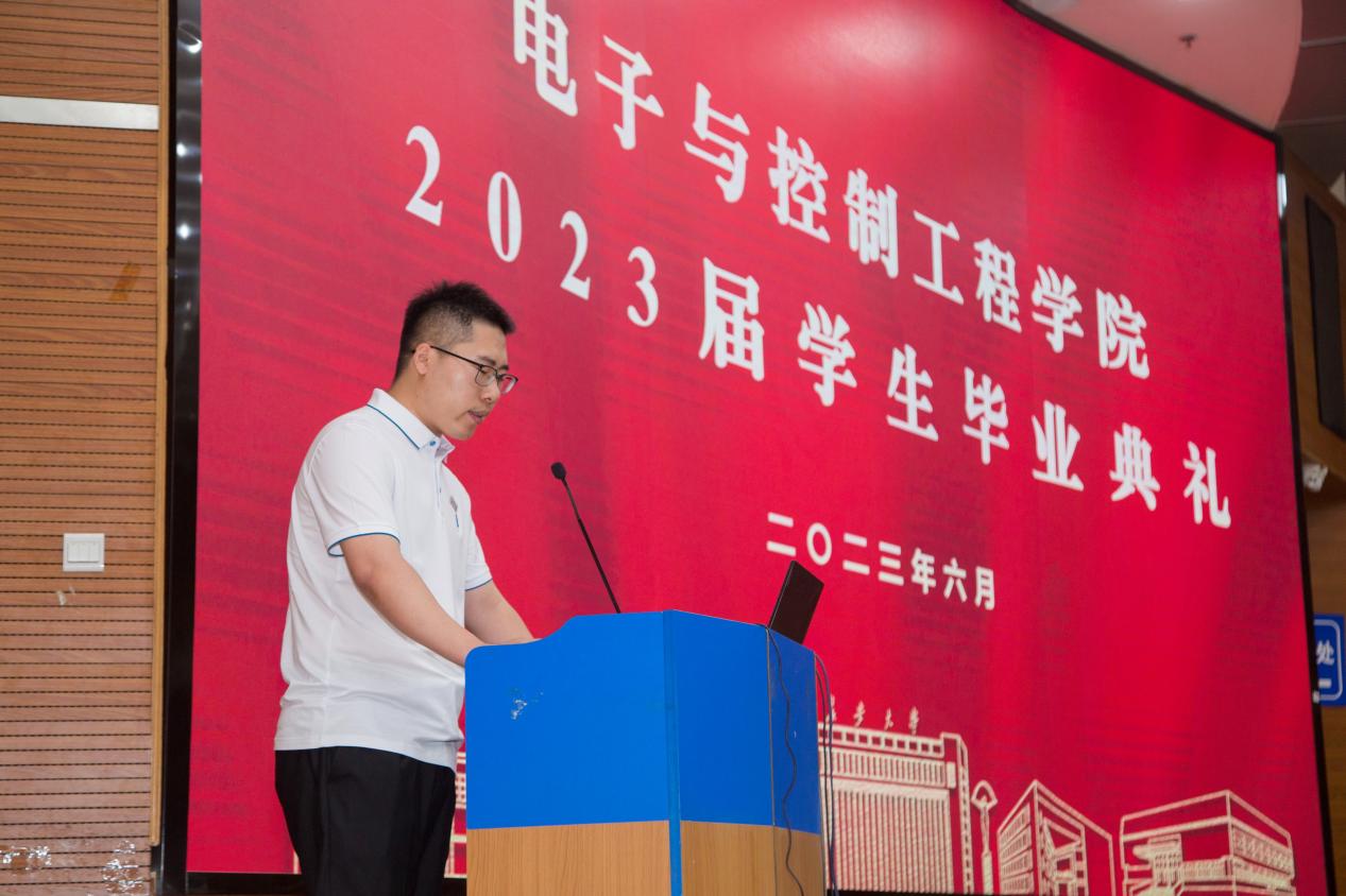 教师代表、电工电子基础教学部及实验教学中心党支部书记杨丽媛在发言中深情回顾了同学们在校的成长经历,向同学们表达了真诚的祝福与期望,勉励同学们砥砺创新、勇担使命,将个人成长与国家命运紧密相连。