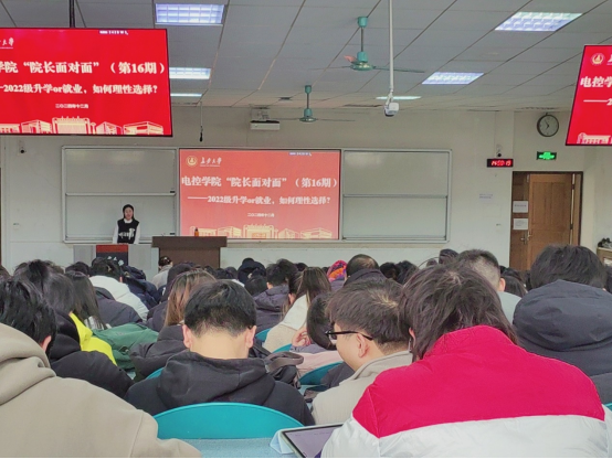 “院长面对面”(第16期)之2022级本科生升学或就业指导在北校区WT1104教室举行,院长闫茂德、院党委副书记高婷婷,学办主任刘平利出席讲座,2022级辅导员李慧及2022级全体学生参加,讲座由李慧主持。