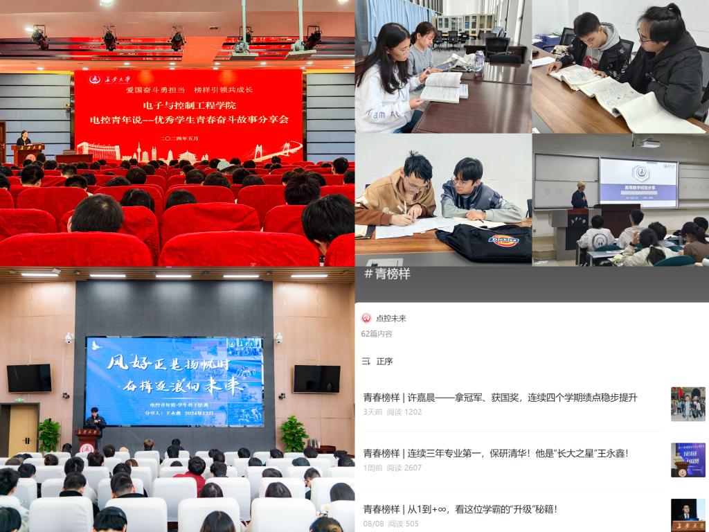 坚持榜样示范,营造学风建设之“势”。学院注重挖掘和选树优秀学生典型,开展“学霸讲堂”“电控青年说”经验分享会、学习交流会等活动覆盖1000余人;充分发挥学生骨干和学生党员的示范、带动和辐射作用,加强学业朋辈导师队伍建设,建立帮扶小组、学业困难学生结对子制度,实现学业帮扶精细化服务。依托学院“点控未来”微信公众号,推出“青榜样”风采展20余期,形成比学赶超的良好学习氛围。“点控未来”连续2年入选“高校思想政治工作200个最受欢迎公众号”。