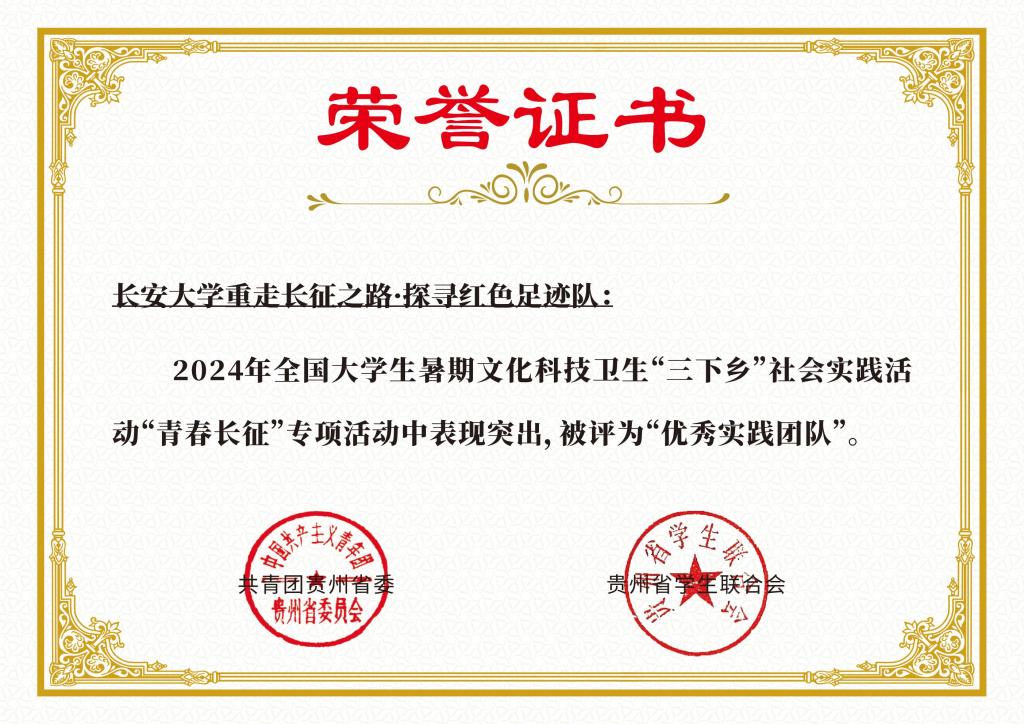 近日,共青团贵州省委评选公布了2024 年全国大学生暑期文化科技卫生“三下乡”社会实践活动“青春长征”专项活动表彰名单,长安大学赴贵州“重走长征之路·探寻红色足迹”暑期社会实践队获评优秀实践团队