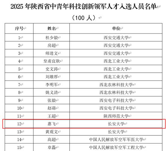 近日,陕西省科学技术厅发布了《关于公布2025年陕西省中青年科技创新领军人才、科技创新创业人才及2026年青年科技新星入选人员的通知》(陕科人才函〔2025〕355号),太阳城投注中心 惠飞教授入选2025年陕西省中青年科技创新领军人才。